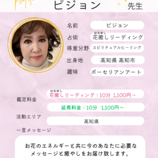 六花先生🌻算命学・数秘・風水・カード鑑定 ― 六花先生―やわらかな雰囲気と、キュートな笑顔が印象的な六花先生。その佇まいからは想像できないほど、鑑定は深く現実的で、人生を前に進める力に満ちています。算命学・数秘術・風水を軸に、ルノルマンカー...