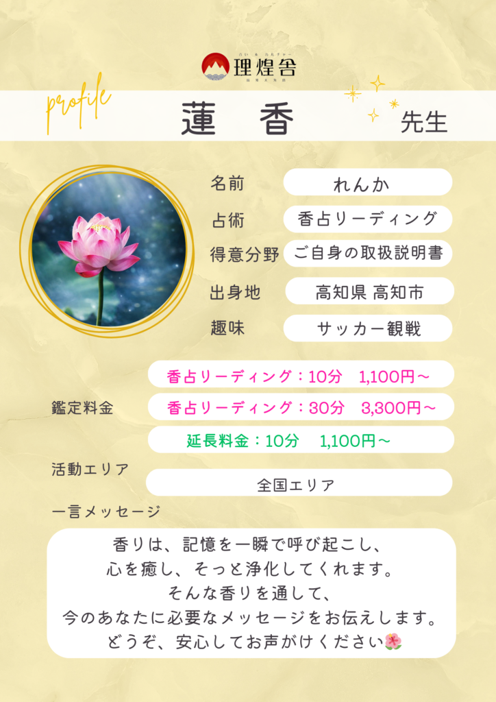 蓮香先生は、その香りの力を通して、今のあなたに必要なメッセージを丁寧に読み解き、まるで「ご自身の取扱説明書」を受け取るような気づきの時間を届けてくださいます。