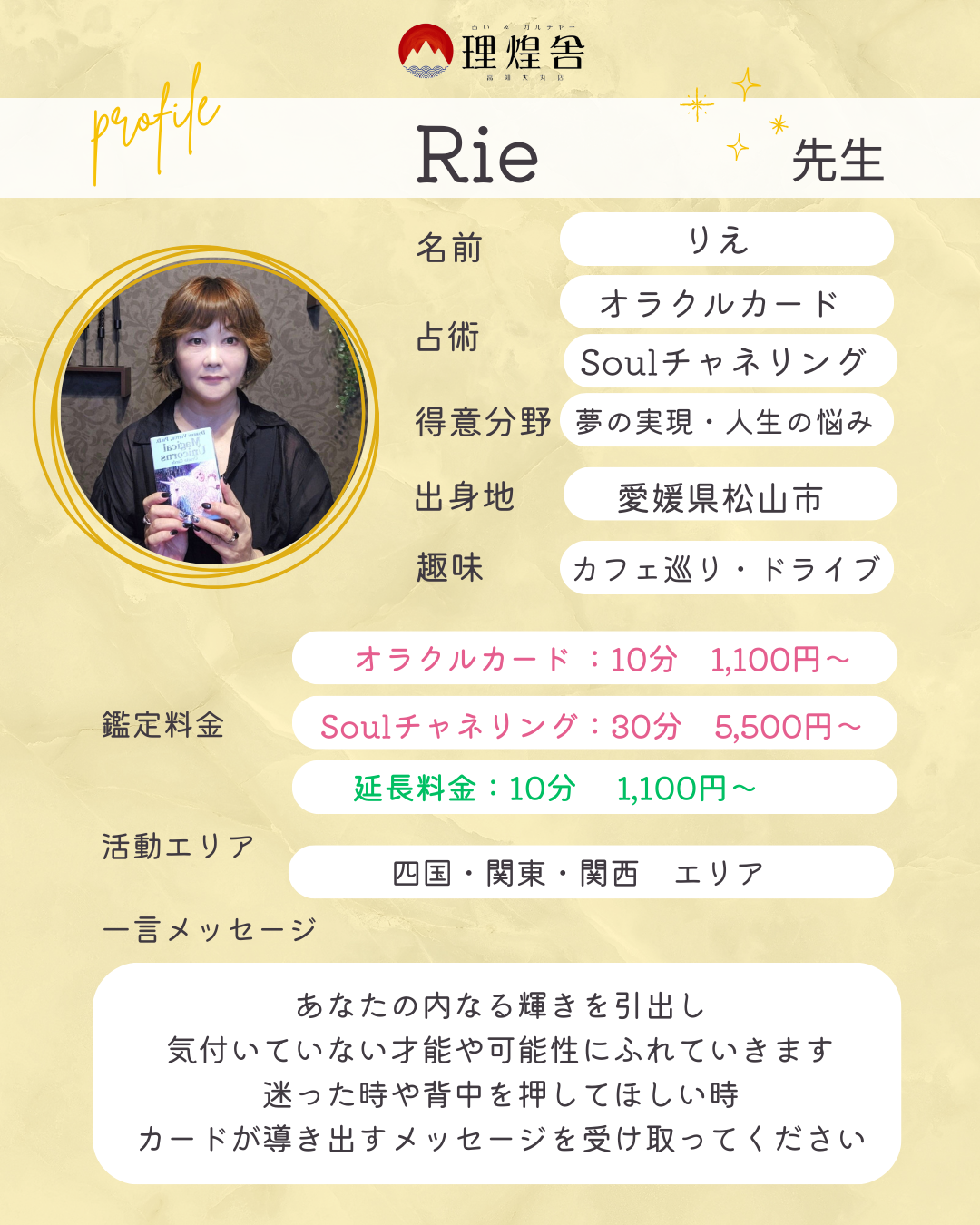 迷いや不安で心が揺らぐ時、誰にも言えない想いを抱えている時、ただ静かに受け止めてもらいたい時に、Rie先生は優しく背中を支え、もう一度前を向く力を思い出させてくれる存在です。