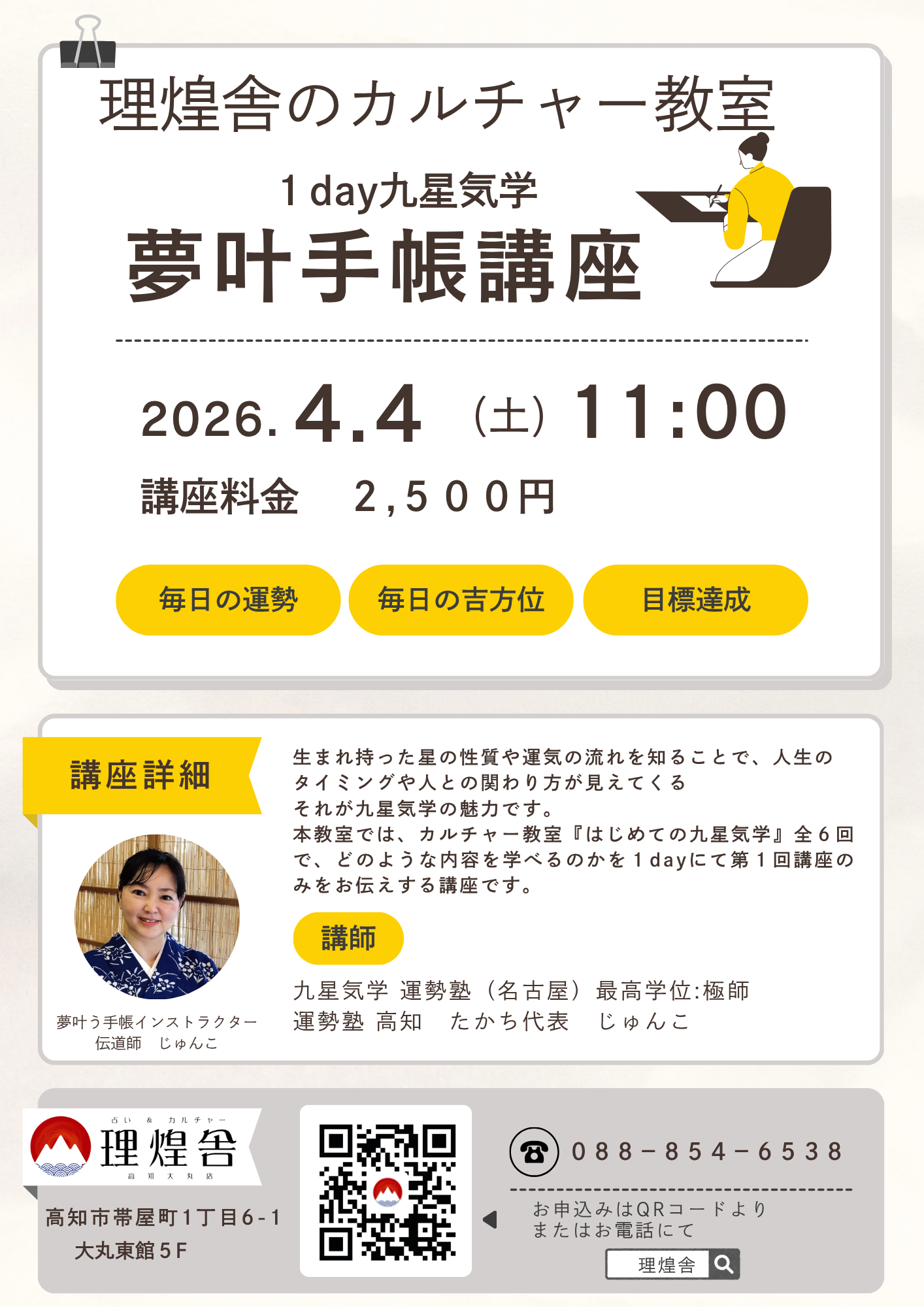 【カルチャー】1day 九星気学 書けば叶う!!夢叶手帳講座