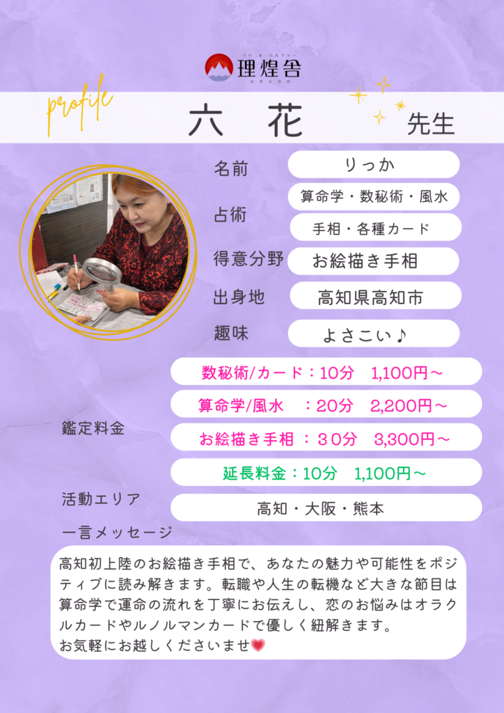 お絵描き手相・算命学・数秘・風水・カード鑑定 ― 六花先生―